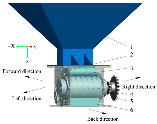 The 3D model of a centralized seed-metering device for rapeseed. Note: (1) seed box, (2) shell, (3) seed-cleaning brush, (4) seed-metering mechanism, (5) transmission mechanism, (6) seed outlet. The forward and back directions were the forward and back directions in the view of the seeder, respectively. The left and right directions were from the view of the back direction. The X direction, Y direction, and Z direction were directions from left to right, directions from forward to back, and direction of gravity, respectively. The same is true elsewhere.