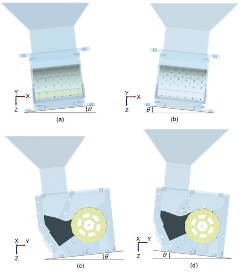 When a seeder operates under various seedbed surface conditions, the working status of the centralized seed-metering device includes four types of tilting angle [3], namely, (a) tilting to −X direction (i.e., slope to the left), (b) tilting to X direction (i.e., slope to the right), (c) tilting to −Y direction (i.e., descending a slope), and (d) tilting to Y direction (i.e., ascending a slope) (Figure 2). The X direction, Y direction, and Z direction are from left to right, from forward to back, and gravity direction, respectively. The centralized seed-metering device inclines to the left or right when the seedbed surface is laterally inclined (Figure 2a,b). When the seeder is uphill, the centralized seed-metering device inclines towards the front and seeds in the seed-filling chamber are opposite to those in the Y direction (Figure 2c). The centralized seed-metering device tilts towards the back and seeds incline to the Y direction when the seeder goes downhill (Figure 2d). Generally, the seed layer changes when the seedbed surface is on a sloped field or uneven surface. A slope of θ represents the inclination angle of different slope tests.