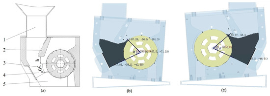 Structure of the centralized seed-metering device (a), seed-filling angle in left side view (b), and seed-filling angle in right side view (c). Note: (1) seed hopper, (2) seed layer adjusting plate, (3) seed chamber, (4) seed-metering mechanism, (5) shell. Note that α was the seed-filling angle.