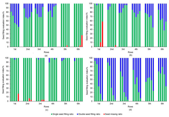 where P1, P2, P3, P4, and P5 are the ratios of single seed-filling, double seed-filling, missing seeds, multiple seed-filling (>3 seeds per ridge), and qualified seed-filling quantity (seed number of 1–3 seeds per ridge), respectively. N1, N2, N3, and N4 are the ridge numbers of single seed-filling, double seed-filling, missing seeds, and multiple seed-filling, respectively, and N is the total number of sample ridges.