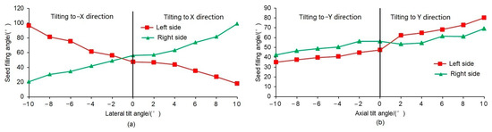 (a) Simulation results indicated that the inclination angle had a significant effect on seed-filling characteristics. Seed-filling angle and double seed-filling ratio increased on the inclination side with the increase of the inclination angle. The missing seeds ratio and the deviation of the seed layer height on two sides increased with an increase in the lateral inclination angle (−X and X directions). When inclined to the forward direction (−Y direction), the seed-filling angle and double seed-filling ratio significantly decreased, and the missing seeds ratio increased with the increasing inclination angle. The increase of the inclination angle in the back direction (Y direction) increased the seed-filling angle, double seed-filling ratio, and seed layer height, causing poor seeding performance at θ > 8°.