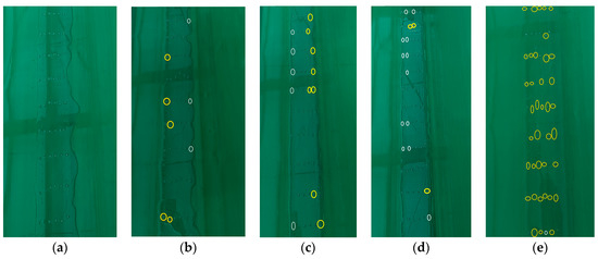 Seed distribution on oiled belt: (a) θ = 0°, (b) tilting to −X direction at θ = 6°, (c) tilting to X direction at θ = 6°, (d) tilting to −Y direction at θ = 6°, and (e) tilting to Y direction at θ = 6°. Note that circles in white and yellow represent missing seeds and ≥2 seeds per ridge, respectively.