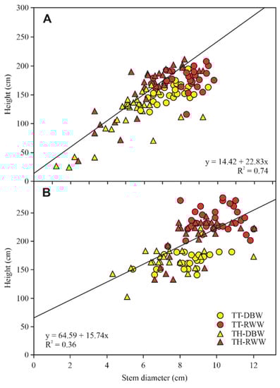 Stem diameter (A) and height (B) of Jatropha curcas at two different stages of cultivation and under different treatments. Figure adapted from [68].