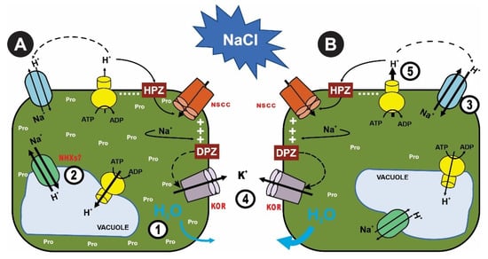 (A) Osmotic adjustment through the accumulation of compatible solutes such as proline in leaves and roots to prevent the loss of water (1). Na+ compartmentalization in vacuole-like structures suggests the involvement of vacuolar and endosomal Na+/H+ antiporters (NHX) (2). (3) Na+ extrusion or efflux from the cytosol to the apoplast by SOS1 exchangers (3). (B) Regulation of K+ homeostasis through K+ retention in roots is crucial in plants (4). (5) Increase in the H+-ATPase activity to cell membrane repolarization or Na+ extrusion. KOR: outward-rectifying K+ channels (5). HPZ is hyperpolarization, and DPZ is depolarization. Modified from the work of Quintal, Velarde-Buerdía et al. (2014).