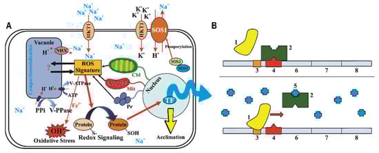 (A) The interaction between reactive oxygen species (ROS) produced from Na+ signals. The ROS signature, promoted by an unknown pathway, compartmentalizes Na+ into vacuoles. In the tonoplast, H+ pumps equilibrate this compartmentalization. The ROS signature promotes the upregulation of a protein oxidation system that connects to the nucleus, promoting transcription factor (TF) activation and promoting some regulation of mitochondria (Mit), chloroplasts (Chl), and peroxisomes (Pr). In another way, the SOS1 channel in the plasma membrane promotes an antiporter flux of Na+ and H+. Na+ and K+ compete with the same plasma membrane channel (HKT1). (B) Model proposed for the interaction between NaCl and catalase (CAT) gene expression. On non-salt-stressed plants (upper panel), the RNA polymerase (1) does not translate the CAT genes because there is a repressor (2) occupying the operon (4) on the CAT-encoding gene. Therefore, in salt-stressed plants (bottom panel), the H2O2 (5) binds to repressor that remains inactive and then dissociates from the CAT-encoding gene. Afterwards, the RNA polymerase binds to promoter region (3) on the CAT-encoding gene and then promotes the translation of CAT1 (6), CAT2 (7), and CAT3 (8). Modified from the work of Choudhary, Rivero [85] and Muchate, Nikalje [79].