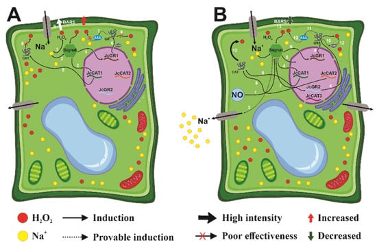 Model proposed for responses to salt stress. (A) Upon salt stress exposure, (1) the accumulation of sodium (Na+—yellow circles) inside the cells promotes an increase in hydrogen peroxide (H2O2—red circles) content. In parallel, (2) a still-unknown signaling pathway recognizes the H2O2 and Na+ accumulation and triggers an upregulation of (3) JcCAT1 and (4) JcGR1 gene expression, resulting in improved (5) catalase (CAT) and (6) glutathione reductase (GR) activities, respectively. The enhanced GR activity is caused by a greater (7) ascorbate (ASA) content. Nonetheless, these responses are not effective (8) for H2O2 scavenging, resulting in severe damage to (9) membrane lipids. (B) Yet, NO priming (1) quickly activates the signaling pathway, reprogramming the salt responses. First, (2) it recognizes Na+ accumulation and seems to activate (3) the effective extrusion of Na+ back into the medium. Secondly, it induces the upregulation of (4) JcCAT1, (5) JcCAT2, (6) JcGR1, and (7) JcGR2 gene transcripts, which better direct (8) CAT and (9) GR activity. At the same time, the GR increases the contents of (10) glutathione (GSH) and (11) ASA. Finally, (12) the H2O2 is almost scavenged, (13) avoiding damage to membrane lipids in embryo axis cells and enhancing the salt tolerance of J. curcas seedlings. Modified from the work of Gadelha, Miranda [78].
