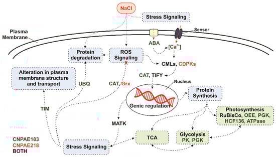 Model proposed for the gene modulation pathway in response to NaCl in two different genotypes of Jatropha curcas subjected to 48 h of 750 mM of NaCl. ABA, abscisic acid. CMLs, calcium-binding proteins. CDPKs, calcium-dependent protein kinase. MYB, MYB Transcription factor family. TIFY, TIFY transcription factor family. RuBisCO, ribulose 1,5-bisphosphatase carboxylase-oxygenase. OEE, oxygen-evolving protein. PGK, phosphoglycerate kinase. HCF136, photosystem II assembly/stability factor. ATPase, ATP synthase. PK, pyruvate kinase. MATK, maturase K. TIM, translocase of the mitochondrial inner membrane. UBQ, ubiquitin transferase. CAT, catalase. Grx, glutaredoxin. Modified from the work of Corte-Real, Oliveira [75].