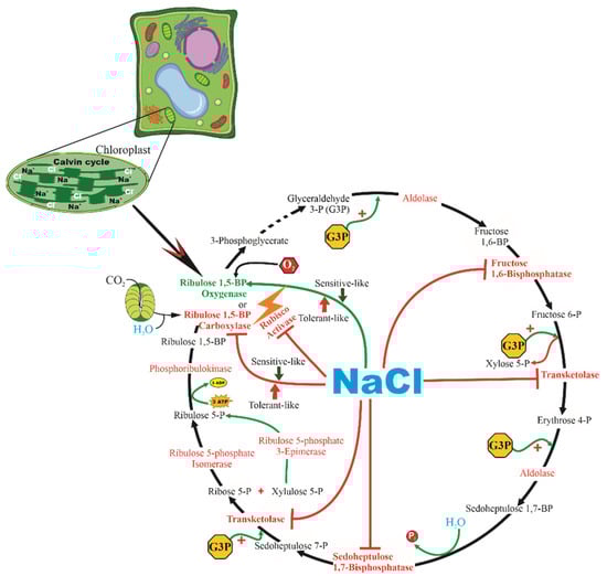 Model proposing that the Na+ and Cl− ions promote the downregulation of many enzymes, such as RuBisCO activase, fructose 1,6-bisphosphatase, transketolase, sedoheptulose 1,7-bisphosphatase, and ribulose 5-phosphate isomerase, inhibiting the conversion of ribose 5-phosphate to ribulose 5-phosphate. On tolerant-like plants, Na+ and Cl− promote the downregulation of the carboxylase activity and promote the oxygenase activity of ribulose 1,5-bisphosphatase carboxylase-oxygenase. On the other hand, on sensitive-like plants, Na+ and Cl− promote the downregulation of the oxygenase activity of ribulose 1,5-bisphosphatase carboxylase-oxygenase, thus promoting carboxylase activity. Model constructed using data presented by Lin, Li [98] and Sivakumar, Sharmila [48].