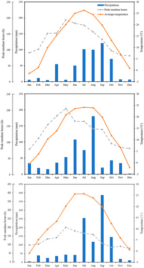 This study was conducted on 10-year-old ‘Vitis vinifera L. Cabernet sauvignon’ grapevines grown in a commercial vineyard in Xia County, Shanxi Province (lat. 35°24′ N, long. 111°17′ E, alt. 433 m), China. The monthly precipitation, peak sunshine hours, and average temperature data in Xia County are shown in Figure 1.