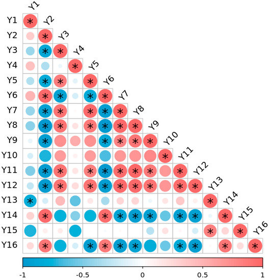 Pearson correlation analysis of general composition of grapes, polyphenols, and fruiting status in 2021. Note: Y1: fruiting branch rate; Y2: fruiting coefficient; Y3: 100-berry weight; Y4: total soluble solid (TSS); Y5: reducing sugar (RS); Y6: titratable acid (TA); Y7: maturity factor; Y8: total phenol of skin; Y9: total tannin of skin; Y10: total flavonoid of skin; Y11: total flavan-3-ol of skin; Y12: total anthocyanin of skin; Y13: total phenol of seed; Y14: total tannin of seed; Y15: total flavonoid of seed; Y16: total flavan-3-ol of seed. ‘*’ indicates a significant correlation between the two factors at the 0.05 level. Red indicates a positive correlation between the two indicators, and blue indicates a negative correlation. ‘−1~1’ indicates the value of the correlation coefficient. The size of the circle represents the absolute value of the correlation coefficient; the larger the absolute value, the larger the circle and the darker the color.