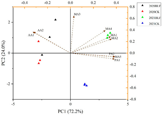 Principal component analysis of anthocyanins in ‘Cabernet sauvignon’ grape skins from BLF and CK treatments in 2020 and 2021. MA1: Delphinidin-3-O-glucoside; MA2: cyanidin-3-O-glucoside; MA3: Petunidin-3-O-glucoside; MA4: Peonidin-3-O-glucoside; MA5: Malavidin-3-O-glucoside; AA1: Peonidin-3-O-(6-O-acetyl)-glucoside; AA2: Malavidin-3-O-(6-O-acetyl)-glucoside; PA1: Trans-Peonidin-3-O-(6-O-p-coumaryl)-glucoside; PA2: Trans-Malavidin-3-O-(6-O-p-coumaryl)-glucoside.