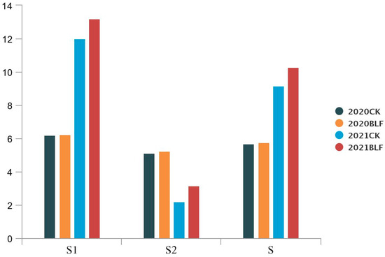 The results showed that there was no significant difference in the scores of principal component 1 (S1) and principal component 2 (S2) and the comprehensive score (S) of the two treatments in 2020, but the scores of the BLF treatment were significantly higher than those of the CK in 2021. Overall, the results indicate that the anthocyanin quality of the 2021 grapes was generally better than that of the 2020 grapes (Figure 5).