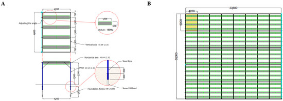 Agro-photovoltaic structure and layout in the experimental paddy field and dry field. (A) Structure of the agro-photovoltaic system. (B) Layout of the 320 dummy panels in the agro-photovoltaic system.