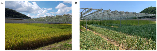 The APV system was installed at the affiliated field of Kyungpook National University (36°14′05″ N, 128°78′14″ E). The APV systems were built in a paddy field and a dry field. The APV systems in the paddy field and dry field covered approximately 1000 m2 (33,600 × 30,000 mm) with a dummy solar panel distance of 1500 mm at a height of 3300 mm (Figure 1A). A total of 320 dummy panels (1675 × 998 mm) were installed in the entire tested area of each field covered by the APV system with a shading rate of 30%, which was the ratio of the area (m2) shaded by the solar panels to the area (m2) of the installed APV system (Figure 1B). Brohm and Khanh [27] reported that the shading rate for the APV systems must be less than 33% to produce solar power in South Korea. Shading on the plant can be reduced by adjusting the angle of inclination, to form 35° angles. Figure 2 shows the APV system in a paddy field and a dry field. Rice was grown in the paddy field under the APV system and the open field (Figure 2A). Onion and garlic plants were grown in the dry field under the APV system and in the open field (Figure 2B).