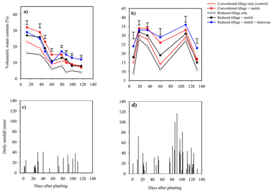 Volumetric water content (0–45 cm) (a,b) and daily in-crop rainfall (c,d) under conventional tillage (control), conventional tillage + mulch, reduced tillage only, reduced tillage + mulch and reduced tillage + mulch + intercropping with cowpea treatments in 2015/16 and 2016/17. Error bars represent LSD0.05.