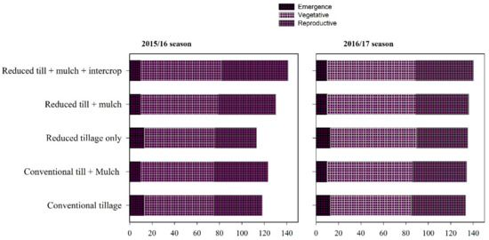 Durations of the emergence (from sowing to emergence), vegetative stage (seedling emergence to ear formation) and reproductive stage (silking to physiological maturity) of the finger millet crop with conventional tillage (control), conventional tillage + mulch, reduced tillage only, reduced tillage + mulch and reduced tillage + mulch + intercropping with cowpea treatments in 2015/16 and 2016/17.