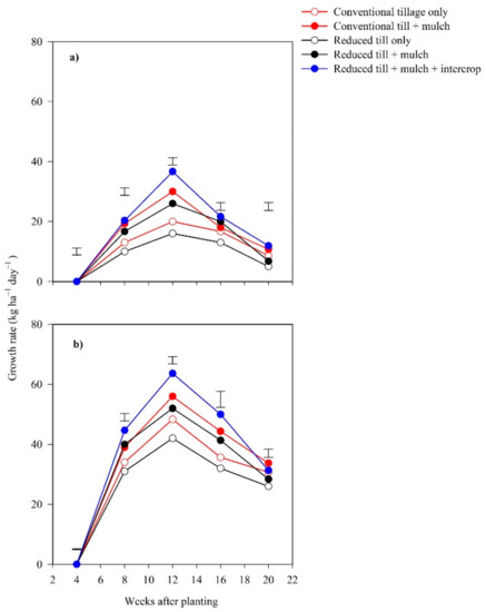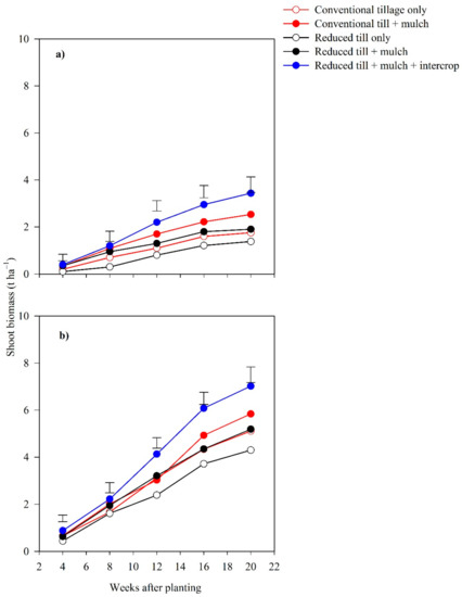 Starting at 12 weeks after planting, the full CA and partial CA2 treatments resulted in the most and least total biomass, respectively, in both cropping seasons (Figure 4a,b). The shoot biomass for the control, partial CA1 and partial CA3 treatments was not significantly different during either season. At 20 weeks after emergence, the full CA had the highest shoot biomass of 3.8 and 7.0 t ha−1 during the 2015/16 and 2016/17 seasons, respectively (Figure 4a,b). This was over 200% and 60% more than the control treatment during the two respective seasons. The difference in shoot biomass was associated with different growth rates for each treatment (Figure 5a,b). The growth rate under the full CA treatment was the highest during both seasons. Mulching caused a significantly higher growth rate compared with the non-mulched counterpart in both years. At 12 weeks after planting, full CA achieved an 83% higher growth rate than the control during the 2015/16 season. On the other hand, partial CA1, as the second-best option, achieved a 50% higher growth rate than the control. During the 2016/17 season, the corresponding increases were 31% and 16%, respectively.