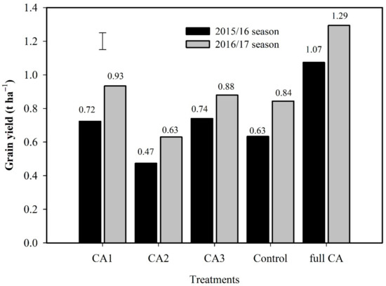 Finger millet grain yield with conventional tillage only (control), conventional tillage + mulch (partial CA1), reduced tillage only (partial CA2), reduced tillage + mulch (partial CA3) and reduced tillage + mulch + intercropping with cowpea (full CA) treatments during 2015/16 and 2016/17 cropping seasons. Error bar represents LSD0.05.