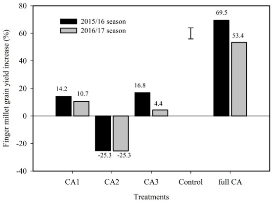 Finger grain yield increase with reference to conventional tillage only (control) with conventional tillage + mulch (partial CA1), reduced tillage only (partial CA2), reduced tillage + mulch (partial CA3) and reduced tillage + mulch + intercropping with cowpea (full CA) treatments during 2015/16 and 2016/17 cropping seasons. Error bar represents LSD0.05.