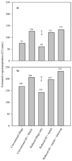 Seasonal evapotranspiration (ET, mm) for individual plots was determined according to Equation (1).