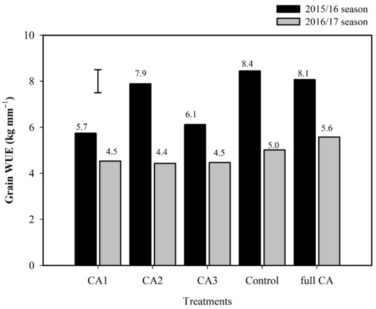 Grain water use efficiency in finger millet under conventional tillage only (control), conventional tillage + mulch (partial CA1), reduced tillage only (partial CA2), reduced tillage + mulch (partial CA3) and reduced tillage + mulch + intercropping with cowpea (full CA) treatments under finger millet during 2015/16 and 2016/17 cropping seasons. Error bar represents LSD0.05.