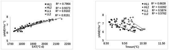 Correlation between temperature and yield during the whole growth period. HL1: 2017–2018 Donghai County test site, HL2: 2018–2019 Donghai County test site, LL1: 2017–2018 Jianhu County test site, LL2: 2018–2019 Jianhu County test site.