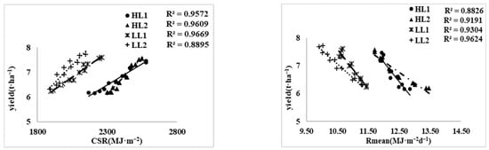 Correlation between radiation and yield during the whole growth period. HL1: 2017–2018 Donghai County test site, HL2: 2018–2019 Donghai County test site, LL1: 2017–2018 Jianhu County test site, LL2: 2018–2019 Jianhu County test site.