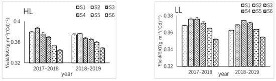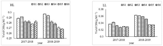 The ratio of yield to cumulative solar radiation at two latitudes in 2017–2018 and 2018–2019. S1, S2, S3, S4, S5 and S6 represent the sowing dates of31 October, 10 November, 20 November, 30 November, 10 December and 20 December, respectively. HL: Donghai County test site, LL: Jianhu County test site. The vertical strip represents the standard error of the average value of the two varieties (nasty 2).