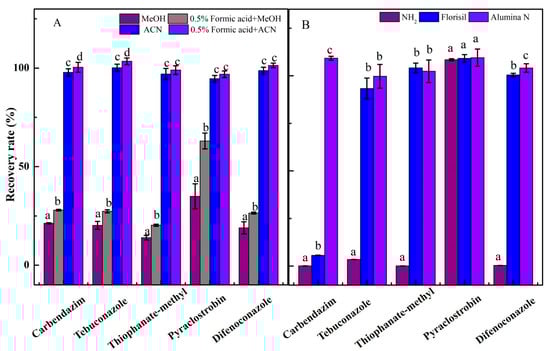 Extractants and cleanup sorbents play an important role in the efficiency of extraction and cleanup [28]. The extraction solvent was the main factor affecting the extraction efficiency. Organic solvents such as ACN, MeOH, and acetone are commonly used as extraction solvents. An appropriate amount of acid mixed with the extraction solvent might improve the extraction efficiency [29,30]. The extraction efficiency of five fungicides in pear samples was evaluated using four organic solvents, MeOH, MeOH with 0.5% formic acid, ACN, and ACN with 0.5% formic acid. The results showed that the recovery rates of the five fungicides except for pyraclostrobin were less than 50% when MeOH or MeOH with 0.5% formic acid was used as the extraction solvent, indicating that MeOH was not suitable for the extraction of the five fungicides (Figure 1A). For ACN or ACN with 0.5% formic acid, the recovery rates were greater than 90%, which met the requirements of residual analysis of pesticides. No significant difference in the extraction efficiencies for thiophanate-methyl, pyraclostrobin, or difenoconazole was observed between ACN and ACN with 0.5% formic acid as the extraction solvent, while the extraction efficiencies for carbendazim and tebuconazole using ACN with 0.5% formic acid were superior to those of ACN. These results indicated that ACN with 0.5% formic acid was the most suitable solvent for the extraction of the five fungicides in pears. This might be related to the better penetrability and lower lipophilic properties of ACN.