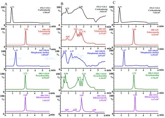 Figure 2. Typical UPLC–MS/MS multiple reaction monitoring chromatograms of the five fungicides from the standard solution (0.1 mg/L) (A), blank pear sample (B), and spiked pear sample (1 mg/kg) (C).