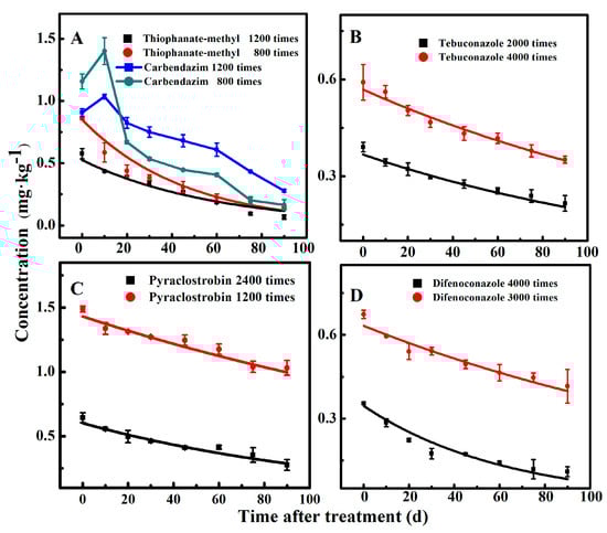 where Ct is the concentration of tebuconazole, thiophanate-methyl, pyraclostrobin, or difenoconazole at time t (mg/L); C0 is the initial concentration; and k is the dissipation rate constant.