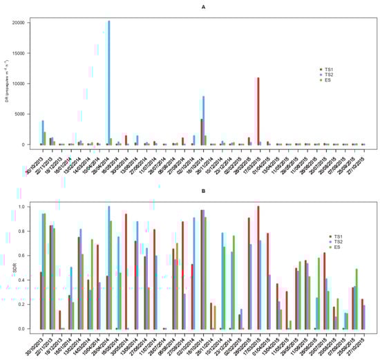 Time series of the propagule deposition pattern of Cryphonectria parasitica. The average propagule deposition rate (DR) is reported in propagules·m−2·h−1 (panel A), and the corresponding standardized deposition rate (SDR, Panel B) is shown. Deposition rates are displayed for the different study sites (TS1, TS2, and ES) and sampling dates in the period between October 2013 and October 2015.