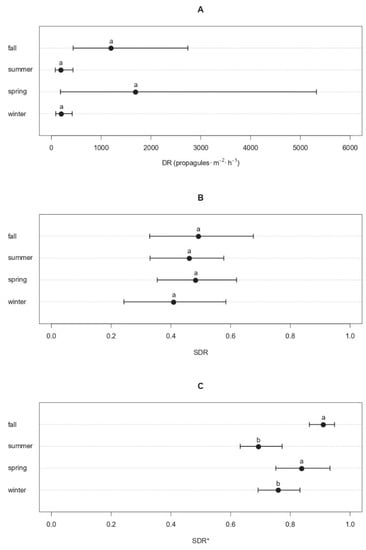 Seasonal patterns of the propagule deposition of Cryphonectria parasitica. Dots represent the mean rate of propagule deposition (DR) in propagules·m−2·h−1 (panel A), the average standardized deposition rate (SDR, panel B), or the average SDR of C. parasitica over the baseline of 60 propagules·m−2·h−1 (SDR*, panel C) for each season. Whiskers around the dots refer to the 95% confidence intervals. Different letters are used to highlight significant differences (p < 0.05).
