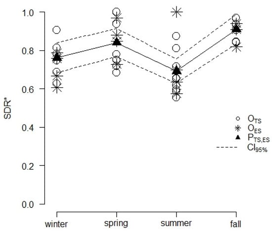 Instead, no significant effects of the calendar month (MS) of sampling on SDR* were detected (c = 0.189 and p = 0.887). The cosine regression model showed that the average SDR* followed a seasonally-driven periodic behavior (Figure 3). All parameters of the regression equation were significant, with (t = 36.690 and p < 0.001), (t = 151.150 and p < 0.001), and (t = 59.360 and p < 0.001). The residuals of the model were normally distributed based on the Shapiro–Francia statistics (W = 0.953 and p = 0.193). In comparison to the null model, the cosine regression showed a lower AICc (−40.200 vs. −30.600) and a higher AICcw (0.992 vs. 0.008), thus confirming its adequacy. The cosine regression model run on data from ES was successfully validated since the corresponding OP regression displayed coefficients and comparable to 1 (p = 0.771) and 0 (p = 0.785). The average predicted SDR* values were 0.762 (0.685–0.838 CI95%) and 0.692 (0.628–0.756 CI95%) in the winter and summer, respectively, and 0.840 (0.767–0.913 CI95%) and 0.909 (0.832–0.985 CI95%) in the spring and fall (Figure 3), respectively. These values were consistent with the average SDR* values observed during the same seasons in ES, reaching 0.704 (0.621–0.765) in the winter, 0.727 (0.606–0.924) in the summer, 0.856 (0.757–0.916) in the spring, and 0.889 (0.818–0.929) in the fall.