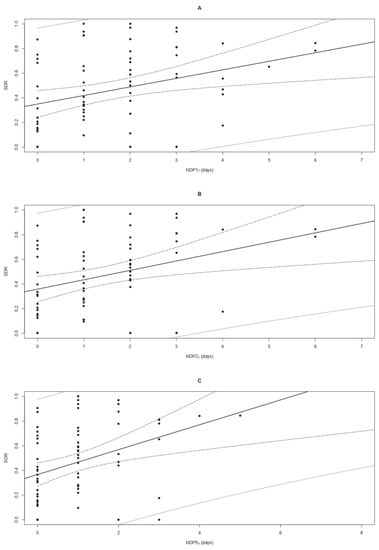 Linear regressions modelling the propagule deposition pattern of Cryphonectria parasitica to the number of days with precipitations over 1, 2, and 5 mm (NDP17—panel A; NDP27—panel B; and NDP57—panel C, respectively) occurring during a timeframe of 7 days. The graphs show the positive correlation between increasing values of NDP17, NDP27, and NDP57 (on the x-axis) and the raising standardized deposition rate (SDR) of C. parasitica (on the y-axis). The points indicate the observed SDR in sites TS1 and TS2, while the continuous lines represent the equations of the regression models. Confidence and prediction intervals at 95% are shown as dashed and dotted lines, respectively.