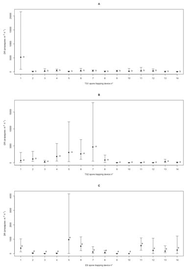 Patterns of the spatial propagule deposition of Cryphonectria parasitica. For sites TS1 (panel A), TS2 (panel B), and ES (panel C), the mean deposition rate (DR) of the fungal pathogen and the 95% confidence interval are displayed for the different spore traps labelled from 1 to 14 as dots and t-shaped lines, respectively. Different letters are used to highlight significant differences (p < 0.05) among average DRs depending on the spore trap locations along the linear transect.