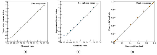 Normal Q–Q Plot of three crops of ramie. (a) First crop ramie; (b) Second crop ramie; (c) Third crop ramie.
