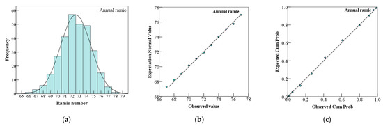 Graphic qualitative judgment of annual ramie. (a) Histogram; (b) Normal Q-Q Plot; (c) Normal P-P Plot.