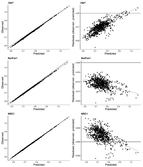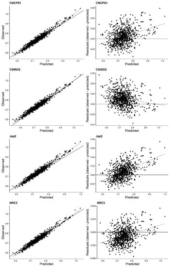 Tier 1 equations, which all used lactose, milk protein, and milk fat as prediction variables and were included in the NRC, NorFor, CSIRO, and Japan systems accurately and precisely predicted the reference milk energy values (R2 = 1.00, RMSEP = 0.01). Among these equations, the NRC equations had the lowest RMSEP of less than 1% of the observed mean with a CCC of 1.0 (Table 4). A large part of the error in the equations from the CSIRO, Japan, NorFor, and NRC was the mean bias, which measured 53%, 88%, 96%, and 59% of RMSEP, respectively (Table 4). Slope bias was significant in all Tier 1 equations. As for the CSIRO equation, the residual value (observed—predicted) became negative as the predicted milk energy increased (Figure 1). The Japan models showed a negative residual when the predicted milk energy was less than 0.96 Mcal/kg, but a positive residual was noted when it was more than 0.96 Mcal/kg (Figure 1). The NorFor equation overestimated milk energy for all milk energy ranges, and the residual increased as the predicted milk energy value increased. The NRC equation showed a positive residual when the predicted milk energy was less than 0.88 Mcal/kg and a negative residual when it was more than that.
