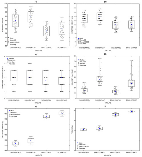 Figure 1e presents a comparison of all of the groups, for both varieties. For the 1000-seed weight, statistically significant differences (p < 0.05; Tukey test) were noted for the following groups: Erica Control and Enrei Control, Erica Extract and Enrei Control, Erica Control and Enrei Extract, and Erica Extract and Enrei Extract. The highest 1000-seed weight was measured for Erica Extract, and the lowest was measured for Enrei Control. Similarly, 1000 seeds collected from the Erica variety treated with extract were heavier than those from Enrei by 16.1%.