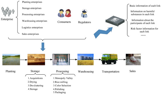 We analyzed the rice supply chain by referring to the supply chain design method [52,53,54,55]. Figure 1 shows the basic structure of the rice supply chain, which contains six main links and nine sub-links, and the participants include various types of enterprises, consumers, and regulators, and the generated data contain information on the contaminants, basic information, and personnel information of each link.