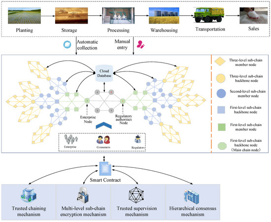 The application of blockchain technology ensures that the data stored on the blockchain cannot be tampered with, thereby maintaining the security and credibility of the data. To achieve the credibility of the whole chain data of the rice supply chain, it is necessary to ensure the security and credibility of the data before the chain. Figure 3 shows the trusted chaining mechanism, which is designed to solve the credibility problem of the collected data. The trusted chaining mechanism is divided into two sub-mechanisms: supervision sub-mechanism and reward and punishment sub-mechanism. For the supervision sub-mechanism, the physical space and work content between the nodes in the same sub-chain is similar, and the same-level supervision mechanism in the chain is implemented. The position level of each node between different levels of sub-chains is different, and the inter-chain progressive supervision mechanism is implemented. For the reward and punishment sub-mechanism, a joint responsibility mechanism is adopted to ensure the credibility of the data. Each node is responsible for each datum through a digital signature.