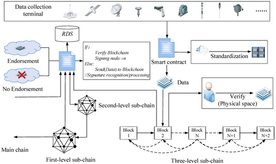 Each node of the third-level sub-chain is verified by the data in the physical space to determine whether the data are authentic (the same-level supervision mechanism in the chain). In this way, the model performs dynamic management of data. If the data are trustworthy, the node authenticates the signature of the data digest according to Equation (3). After the smart contract makes a judgment (the judgment method is shown in Figure 2), the data are encrypted and uploaded to the cloud database.