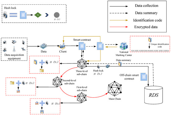 Taking the third-level sub-chain as an example, employees use the collection device to collect data and then store the data summary in the blockchain. After the smart contract judges whether the data are credible, the contract generates a random number N1 and calculates the hash H(N1) (hash lock). Then, H(N1) is used to encrypt the basic data, data digest, and data signature and upload them to the cloud database. The upload method is shown in Equation (4). The smart contract outside the blockchain obtains the data digest by performing the same hash operation on the basic data. Through comparison, it is determined whether the data have been tampered with during transmission.