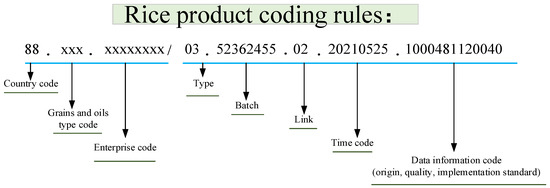 To strengthen the efficiency of the rice supply chain information management and control, a credible supervision mechanism based on identification analysis technology is designed. The National Identification Center assigns a unique identification code to the data of each link. Through identification analysis, regulatory agencies can quickly obtain relevant information about rice. The accuracy of the identification information is compared by the client and the information obtained by scanning the identification with the information in the blockchain to determine whether the identification has been tampered with. The rice supply chain coding rules based on handle codes are designed to ensure the uniqueness of each identification code. The design rules are shown in Figure 5.