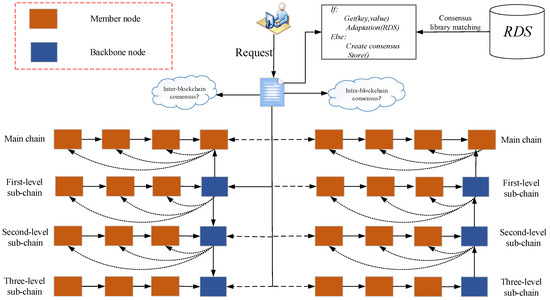 To ensure efficient consensus speed between sub-chains at all levels and the main chain, a hierarchical consensus mechanism is designed. First, the different types of consensus requests are classified (Table 2). Consensus requests are divided into two categories: inter-chain consensus and intra-chain consensus, including new node access, node shutdown, identity update, and new consensus additions. This consensus request is stored on the blockchain, which ensures fast matching of consensus. This research customizes the design of smart contracts, verifies the consensus request, and determines the consensus type. For different types of consensus, the corresponding consensus is carried out, respectively. The consensus process is shown in Figure 6.