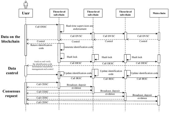 The trusted uploading of data begins with the client submitting data. Taking the third-level sub-chain as an example, the model calls DSSC to standardize the data, and then each node of the third-level sub-chain conducts real-time supervision and digital signatures. DVSC verifies the signature. If the verification fails, DVSC will carry out progressive control: it will review according to the sub-chain level from low to high until it is handed over to the regulatory department for processing. The trusted on-chain process adopts a joint responsibility mechanism. The digital signature of each node is responsible for the data. Through the progressive management and control method, the data can be managed and controlled in real time on the chain. The control part mainly refers to the verification and updating of the identification code. To ensure the accuracy of the regulatory information, the regulatory authorities can control the rice supply chain information. The main process is the following: after the user parses the identification code of the data in the previous link, it is compared with the data in the blockchain for verification. After the enterprise confirms that it is correct, it will supplement the new information in this link and deliver it to the National Identification Center to generate a new identification code. The identification code will be repeatedly verified and updated with the circulation of rice until the final sale. The management and control part is aimed at the data trust verification process between enterprises corresponding to each link in the main chain. The consensus request part mainly refers to the classification of consensus within the blockchain. Through the judgment of the CDSC contract, different types of consensuses can be used for intra-blockchain consensus or inter-blockchain consensus. After the consensus is completed, all nodes are broadcast in the form of P2P, and the certificate is stored on the blockchain.