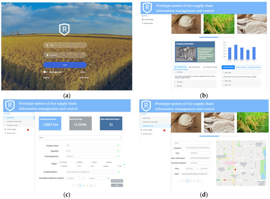 Figure 8a shows the login interface of the prototype system. The user matches the corresponding function by entering the account password. Take an enterprise account as an example to log in. Figure 8b shows the main page of the prototype system. The left side of the interface shows where you are. Above is a carousel of rice pictures. In the middle are the basic introduction of the enterprise and the visual display of the amount of rice processed in half a year. At the bottom of the interface is the information display module, which contains the company culture, introduction of other companies, and the latest news notification. Figure 8c shows the data upload interface. The upper part of the interface shows the amount of rice processed this month, the rate of change compared to the previous month, and the total number of batches. Below is the data submission section. Users submit data as required. The submitted data can be temporarily saved to the system or directly submitted to the blockchain. Figure 8d shows the trusted supervision interface. The client scans the QR code, and the system then parses the identification. On the left is the data information, and on the right is a map display of rice-related locations. Users can compare the data in the blockchain with the parsed data of the identification here. If they are consistent, the identification code has not been tampered with.