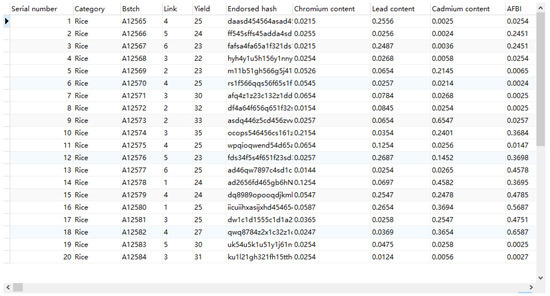 We conducted an example analysis of the prototype system and tested it for a batch of data that was being circulated within the enterprise. Compared with other agricultural supply chains, the rice supply chain can be divided into 13 links, and multiple batches of rice exist in the same link, but a certain batch of rice can only be in a certain link at the same time. The information generated in the rice supply chain is heterogeneous from multiple sources, where the information on hazards is mainly on heavy metal hazards such as chromium, lead, arsenic, and other hazards such as aflatoxin (AFBI) and molds. The basic information is mainly comprised of seed sources, fertilizer sources, logistics information, etc. Personnel information is mainly the information of each participating company, regulatory agencies, and consumers. Data verification is performed on the 20 groups of data on the chain, and one group of data on the chain is shown in Figure 9.