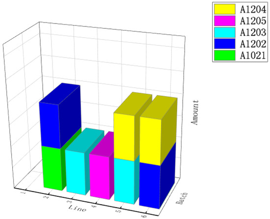 In the company’s data tests, each of the five batches of rice tested above contained six stages of production, storage, processing, warehousing, transportation, and marketing. The X-axis in the figure corresponds to the six links in the rice supply chain. The five colors represent the five batches tested. Batch A1204 shows a yellow square, batch A1205 shows a purple square, batch A1203 shows a sky-blue square, batch A1202 shows a dark blue square, and batch A1021 shows a green square. The batches tested for tampering in the six basic sessions are displayed accordingly. The identification code of the A1201 batch of rice was detected to have been tampered with in the process of storage. The identification code of batch A1202 was detected to have been tampered with during the process of purchase, storage, and sales. The identification code of batch A1203 was detected to have been tampered with during processing and storage. The identification code of the A1204 batch of rice was detected to have been tampered with in the storage and sales links. The identification code of batch A1205 rice was detected to have been tampered with during transportation. Each enterprise relies on the model to accurately identify the fault identification code.